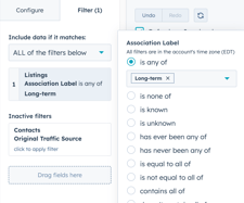 Al crear una lista, puede filtrar los registros en función de sus asociaciones. En el caso de las listas basadas en contactos, puedes filtrar en función de las asociaciones de empresa principal de los contactos. Los usuarios de las cuentas Pro y Enterprise también pueden filtrar los registros en las listas por etiquetas de asociación.