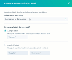 Todas las cuentas de HubSpot pueden utilizar la etiquetaPrimaria para empresas, pero en las cuentas con suscripción Pro o Enterprise , puedes crear etiquetas personalizadas. Las etiquetas de asociación pueden describir relaciones entre todos los objetos de CRM, incluidos contactos, empresas, negocios, tickets, objetos activados por el administrador (por ejemplo, Citas) y objetos personalizados. Por ejemplo:
