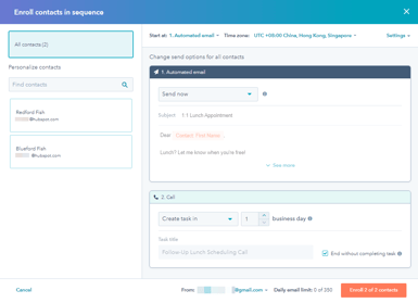 Let op: wanneer je contactpersonen in bulk inschrijft, verzendt HubSpot maximaal drie e-mails per minuut en wordt er rekening gehouden met verzendlimieten. Dit betekent dat je reeks e-mails mogelijk niet onmiddellijk wordt verzonden.