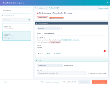 - Als je placeholder-tokens gebruikt in een e-mail en er ontbreken waarden voor de geselecteerde contactpersoon, worden de tokens bovenaan in rood weergegeven.