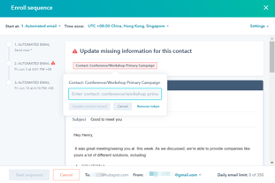 - Sequenties werken niet langer de Lifecycle stage-eigenschap van het contact bij. Als je de Lifecycle stage-eigenschap voor je ingeschreven contactpersonen wilt bijwerken, kun je dat doen met de actieEen waarde voor een eigenschap instellen in een workflow.