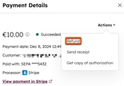 - In the right panel, in the upper right, click Actions, then select Refund. Issuing a refund does not impact the active subscription and billing will continue as scheduled.