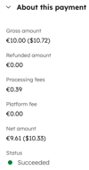 - If you sell in multiple currencies, the related fees will be displayed along with the net amount received in your settlement currency when it differs from the payment currency. For example, if your connected bank account in Stripe is in U.S. dollars, but you collect a payment in Euros, you'll see both the gross amount, fees, and net amount in Euros, but the fees and net amount will also display in U.S. dollars. The FX rate is applied by Stripe.